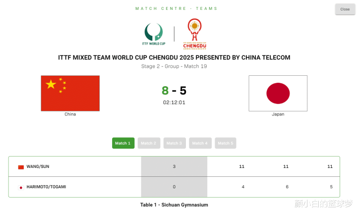 北京时间12月6日,成都混团世界杯第二阶段,中国队VS日本队的焦点战,这场比赛日本队雪藏了男单核心张本智和,但没有张本智和的情况下日本队也打得非常坚韧,前四盘打完日本5-7落后,第五盘女双成为关键,蒯曼/王曼昱1-0张本美和/大藤沙月完成绝杀,国乒8-5击败日乒豪取八连胜,国乒也提前一轮锁定第二阶段头名。
