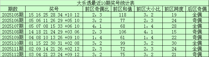 大乐透第25112期奖号为:03、04、21、23、24+09、12。其中前区和值为75,奇偶比为3:2,大小比为3:2。后区开出全大、一奇一偶组合。