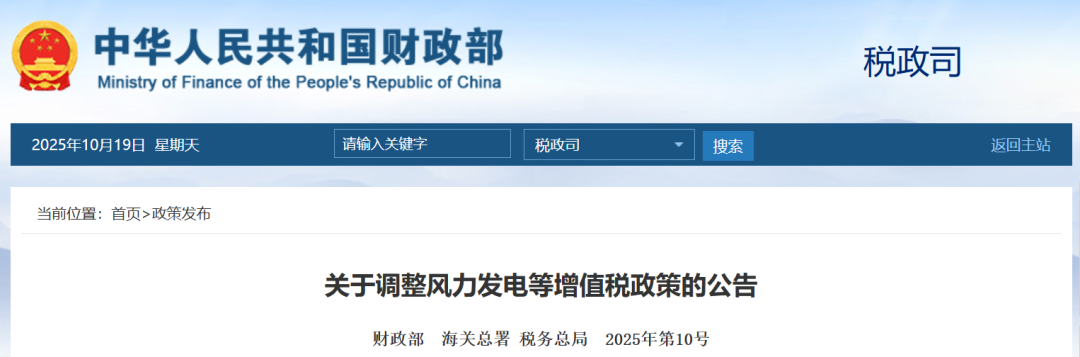 10月17日,财政部、海关总署、税务总局联合发布公告,调整风力发电等增值税政策。根据政策,自2025年11月1日起至2027年12月31日,对纳税人销售自产的利用海上风力生产的电力产品,实行增值税即征即退50%的政策。