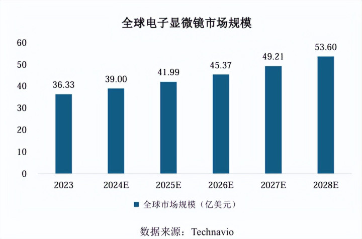招股书披露,2024年全球电子显微镜整体市场规模约 39 亿美元(约合人民币277亿元),预计2028年将增长至54亿美元(约合人 民币383亿元),2023-2028年复合增长率达8.1%。其中,2024年中国电子显微 镜整体市场规模约人民币61.49亿元。