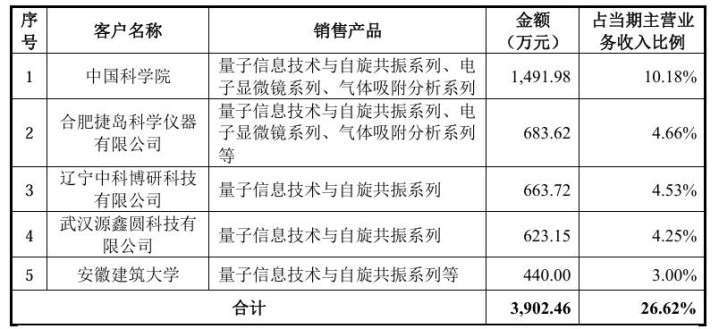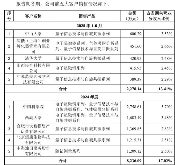 报告期内,国仪量子来自于前五大客户收入合计占主营业务收入的比重分别为 26.62%、24.62%、17.02%和 13.41%,占比较低,且随着营收规模迅速增长呈降低趋势。