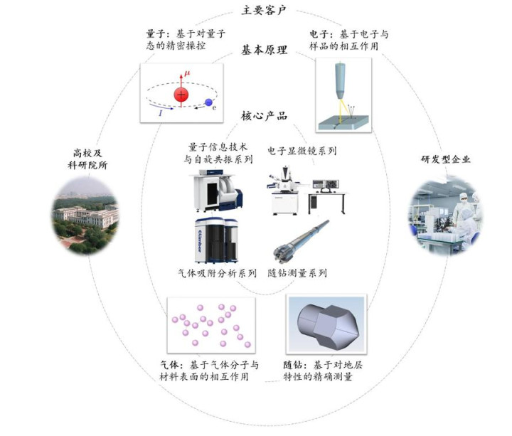 国仪量子承接了将脉冲式自旋磁共振谱仪进行产业化的使命,并以自旋共振技术作为公司 演进与研发的起点。目前,经过自主创新和发展,国仪量子拥有量子传感与自旋共振产业化开发、电子顺 磁共振探头、量子传感器设计加工、自旋调控微波等大量核心技术,并形成量子信息技术与自旋共振系列(含自旋共振系列、量子传感系列、量子计算系列 、微弱信号测量系列 )、电子显微镜系列 、随钻测量系列、气体吸附分析系列、物联网及其他系列等5大系列产品线。