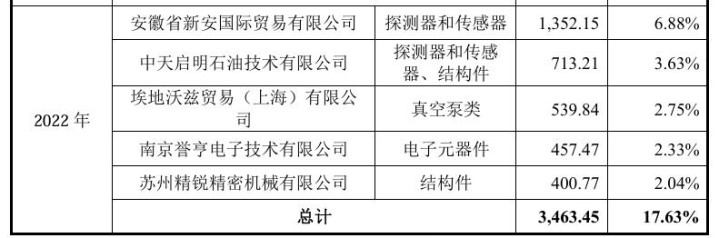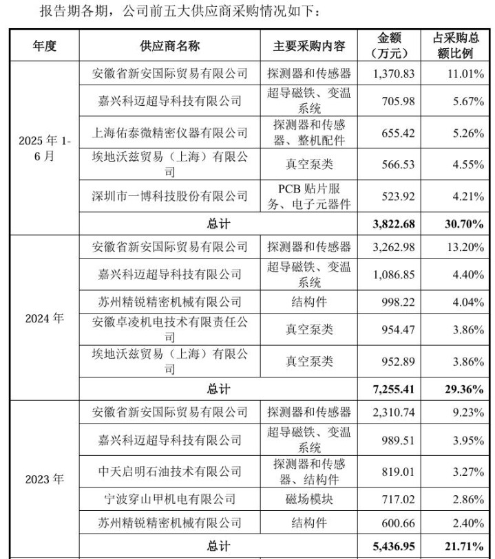 国仪量子主要采购原材料包括结构件、探测器与传感器、电子元器件、电子设备与电 气类等,主要供应商包括安徽省新安国际贸易有限公司、嘉兴科迈超导科技有限 公司、埃地沃兹贸易(上海)有限公司等。报告期内,国仪量子不存在向单个供应商采购比例超过采购总额50%的情形。