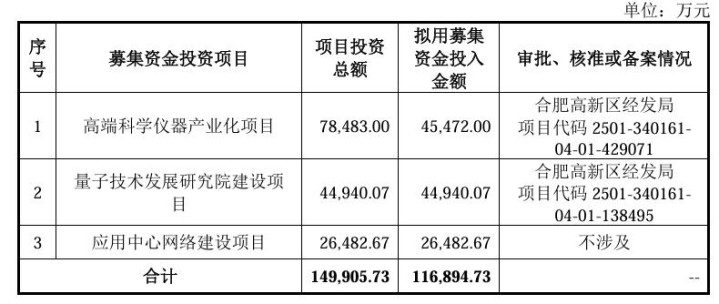 本次募集资金将用于高端科学仪器产业化项目、量子技术发展研究院建设项目 、应用中心网络建设项目等三大板块: