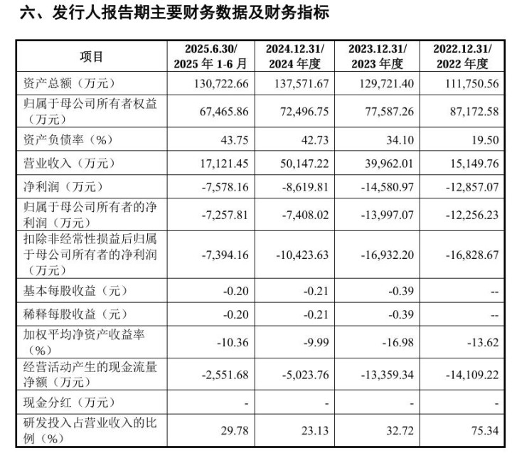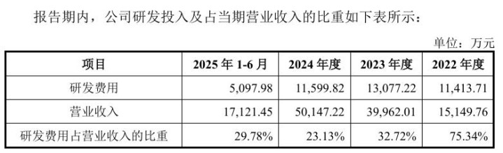 招股书披露,报告期内,公司研发费用分别为1.14亿元、1.31亿元、1.16亿元和5079.978万元,占营业收入的比重分别为75.34%、32.72%、23.13%和29.78%。报告期内研发投入共计4.12亿元,占营业收入总额的33.66%。